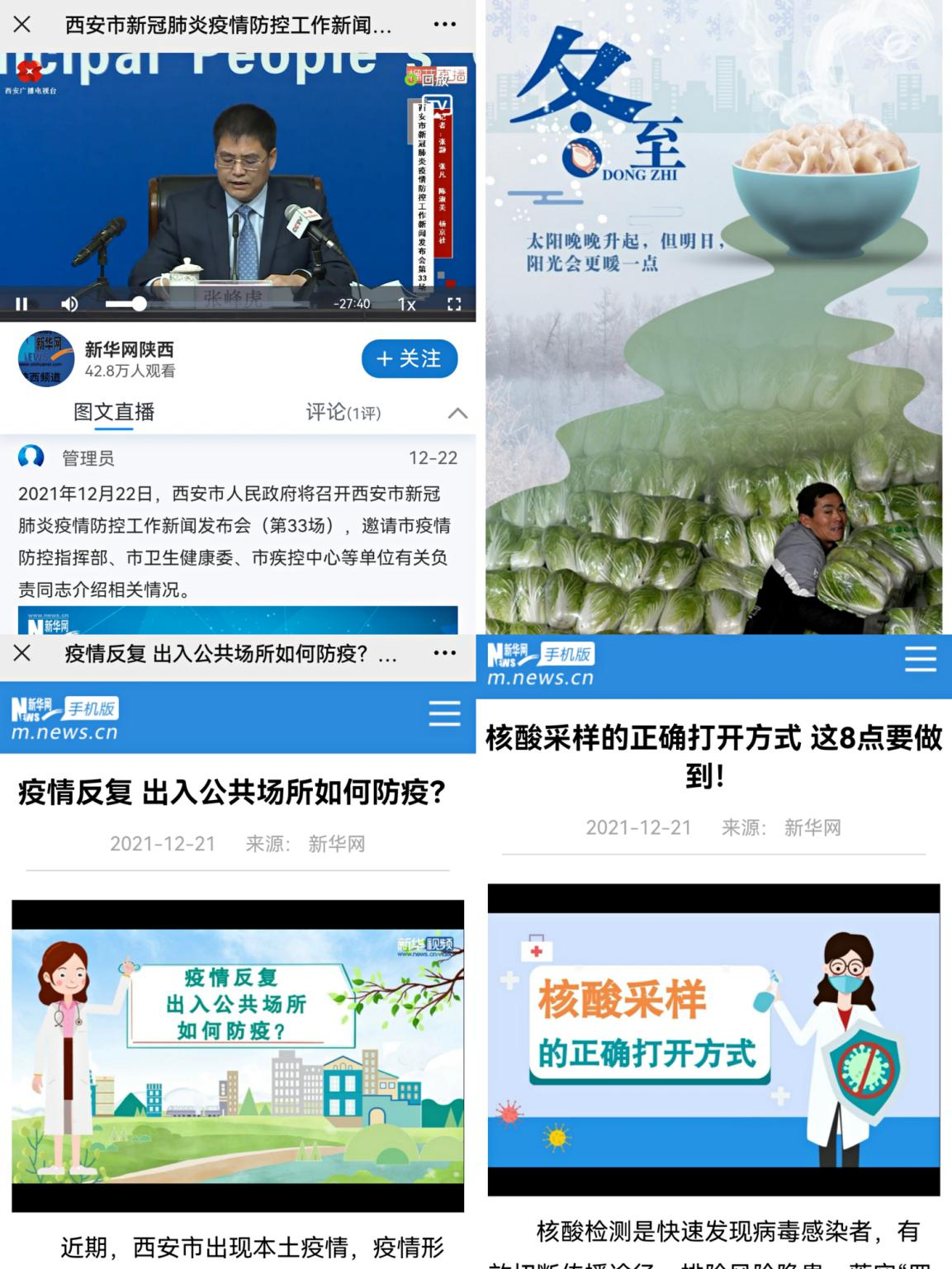借助MG動(dòng)畫短視頻手段,新華網(wǎng)第一時(shí)間向網(wǎng)民提供出入公共場(chǎng)所如何防疫、核酸采樣的正確打開方式等即時(shí)服務(wù)資訊;持續(xù)關(guān)注西安市新冠肺炎疫情防控工作,多平臺(tái)連續(xù)直播數(shù)場(chǎng)新聞發(fā)布會(huì),為網(wǎng)民提供全方位資訊服務(wù);冬至當(dāng)天,制作暖心海報(bào),冬已至,春可期,愿長(zhǎng)安常安!