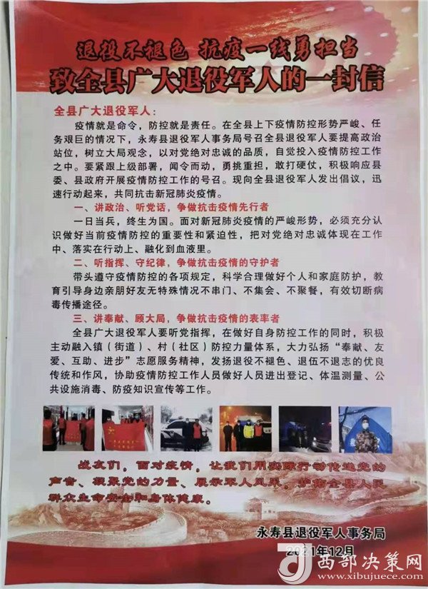 12月24日,永壽縣退役軍人事務(wù)局向全縣廣大退役軍人發(fā)出了《退役不褪色,抗疫一線勇?lián)?dāng)》的一封信,倡議一發(fā)出,志愿者們紛紛主動請纓,聯(lián)名遞交了疫情防控一線作戰(zhàn)的請戰(zhàn)書。連夜集結(jié),在永壽縣退役軍人事務(wù)局召開了“抗擊疫情沖鋒在前”退役軍人志愿者誓師動員大會,局主要負(fù)責(zé)同志向廣大退役軍人志愿者作了戰(zhàn)前動員,大家激情高漲,“必勝、必勝、必勝”的口號響徹整個大樓,用實(shí)際行動堅(jiān)守在疫情防治的第一線。