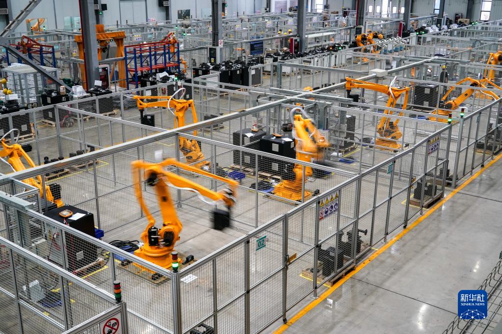 在位于江蘇省南京市江寧區(qū)的南京埃斯頓自動(dòng)化股份有限公司工業(yè)機(jī)器人生產(chǎn)車(chē)間,工業(yè)機(jī)器人在進(jìn)行跑合測(cè)試(7月1日攝)。新華社記者 李博 攝