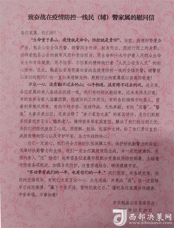 西部決策網(wǎng)訊為表達對奮戰(zhàn)在疫情防控一線民輔警家屬的崇高敬意,感謝他們對公安工作的理解和支持,12月29日下午,勉縣公安局組織開展疫情防控一線民輔警家屬慰問活動,為家屬們送去慰問信和慰問品,并通過他們向奮戰(zhàn)在一線的民輔警傳遞勉縣公安局黨委的溫暖和關(guān)愛,以更加飽滿的熱情、昂揚的斗志投入到疫情防控工作中。