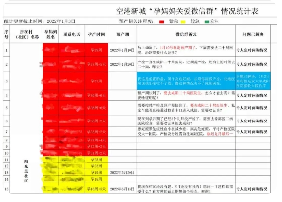 “人命關(guān)天,要趕緊把孕婦的底數(shù)摸清,她們住哪里、電話多少,同時(shí)也要想辦法把現(xiàn)有的醫(yī)生和孕婦‘連起來’,把專業(yè)的事情交給專業(yè)的人來解決。”據(jù)空港新城黨委組織部部長(zhǎng)葛峰介紹,2021年12月31日早上,在了解到陽光里社區(qū)有孕婦需要去醫(yī)院進(jìn)行檢查和分娩的需求后,當(dāng)天下午4點(diǎn)多,社區(qū)黨支部書記殷振建就迅速將22名孕婦的相關(guān)情況及時(shí)上報(bào)給組織部,并由專人對(duì)群里孕媽媽們的訴求進(jìn)行實(shí)時(shí)統(tǒng)計(jì)。