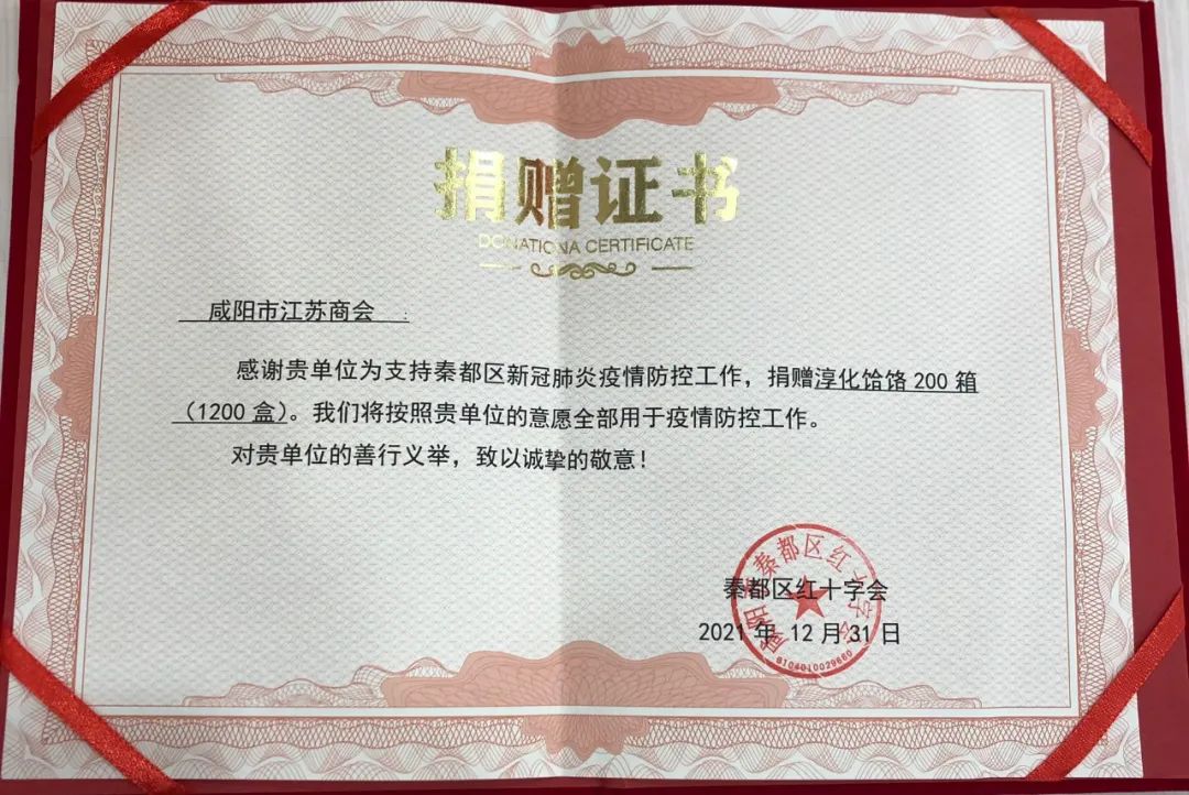 面對(duì)新一輪疫情,咸陽(yáng)市江蘇商會(huì)及會(huì)員企業(yè)以不同的方式表達(dá)對(duì)咸陽(yáng)市一線(xiàn)工作人員的關(guān)懷、對(duì)咸陽(yáng)戰(zhàn)“疫”的支持,展現(xiàn)了一幕幕一心共同抗疫情的感人畫(huà)面,充分展現(xiàn)了咸陽(yáng)市江蘇商會(huì)助力抗擊疫情的決心和信心,秦都區(qū)紅十字會(huì)向咸陽(yáng)市江蘇商會(huì)頒發(fā)捐贈(zèng)證書(shū)。