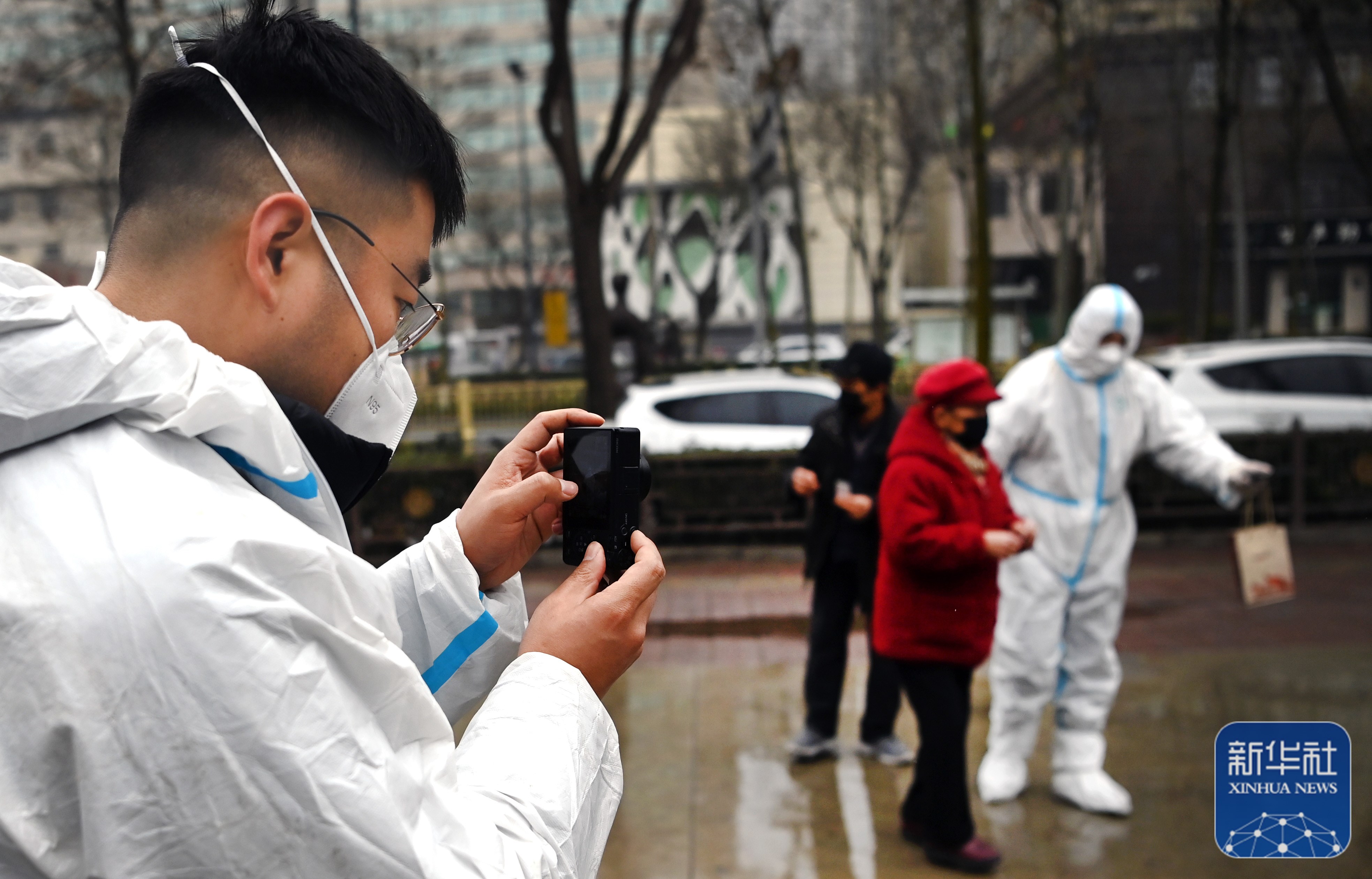 1月8日,許凱(左一)在核酸檢測現(xiàn)場拍攝視頻。他是一名攝影師和視頻博主。
