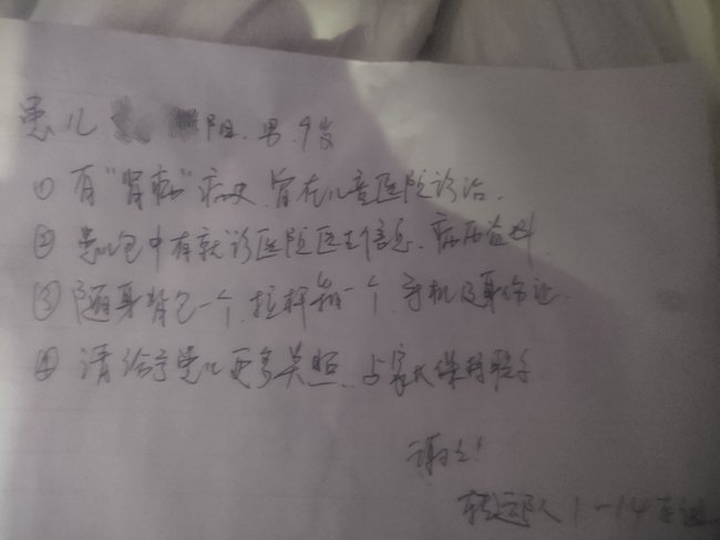 陽(yáng)陽(yáng)(化名)的交接單。西安醫(yī)學(xué)院第二附屬醫(yī)院供圖
