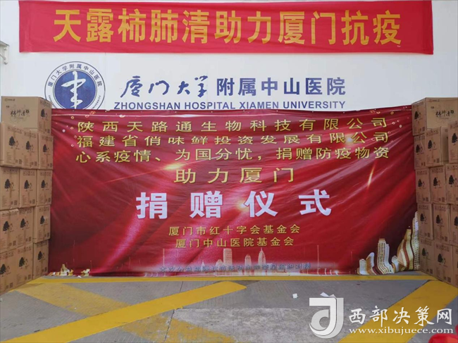 而這也并不是“天露柿肺清”口服液第一次出現(xiàn)在抗疫第一線。早在2021年9月29日,陜西天路通生物科技有限公司就為廈門中山醫(yī)院捐獻(xiàn)過一批抗疫物資,捐贈(zèng)了價(jià)值20多萬“天露柿肺清”口服液作為抗疫物資,支援中山醫(yī)院的一線醫(yī)護(hù)人員們,助力廈門抗疫。當(dāng)時(shí)正值廈門中山醫(yī)院抗擊新冠肺炎疫情的緊要關(guān)頭,天路通生物科技有限公司及時(shí)伸出援助之手,無償捐贈(zèng)抗疫物資,為打贏疫情防控阻擊戰(zhàn)增強(qiáng)了信心和力量。病毒無情,八方友愛,仁者愛人,彰顯出企業(yè)的愛國(guó)情懷和社會(huì)責(zé)任,展現(xiàn)了人間大愛,脈脈溫情。
