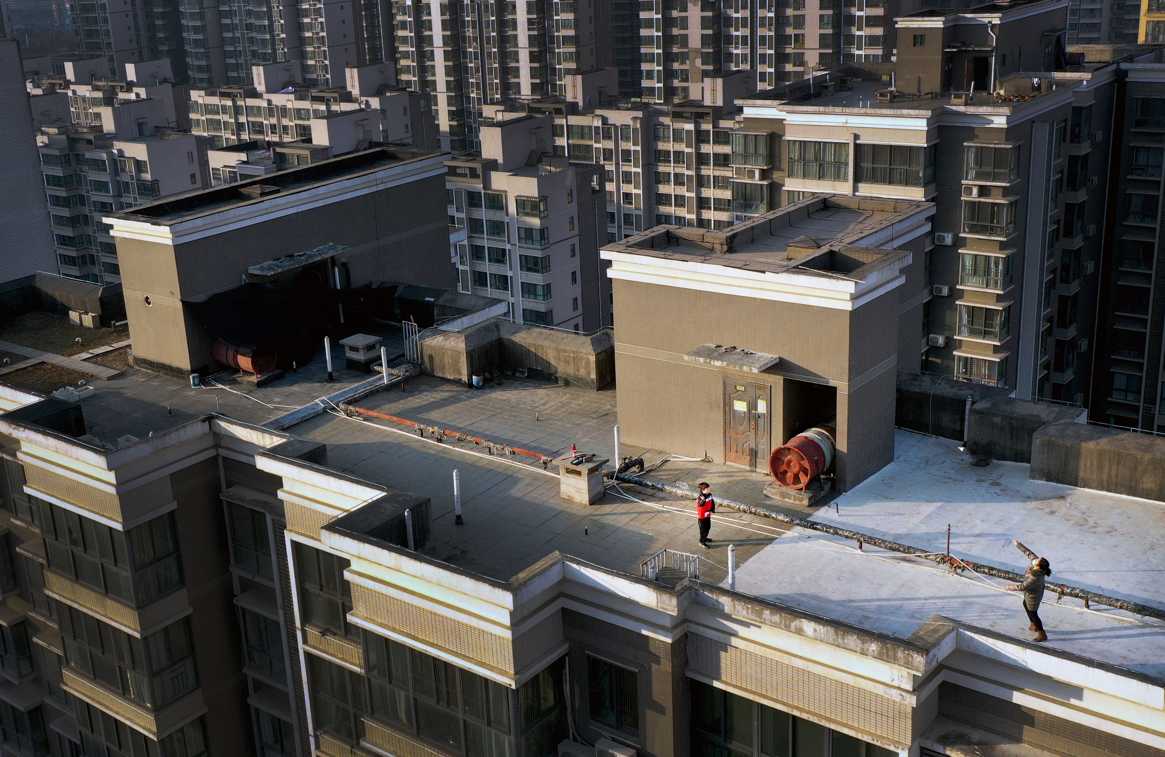 1月14日,西安市一小區(qū)居民在樓頂上打羽毛球(無人機(jī)照片)。