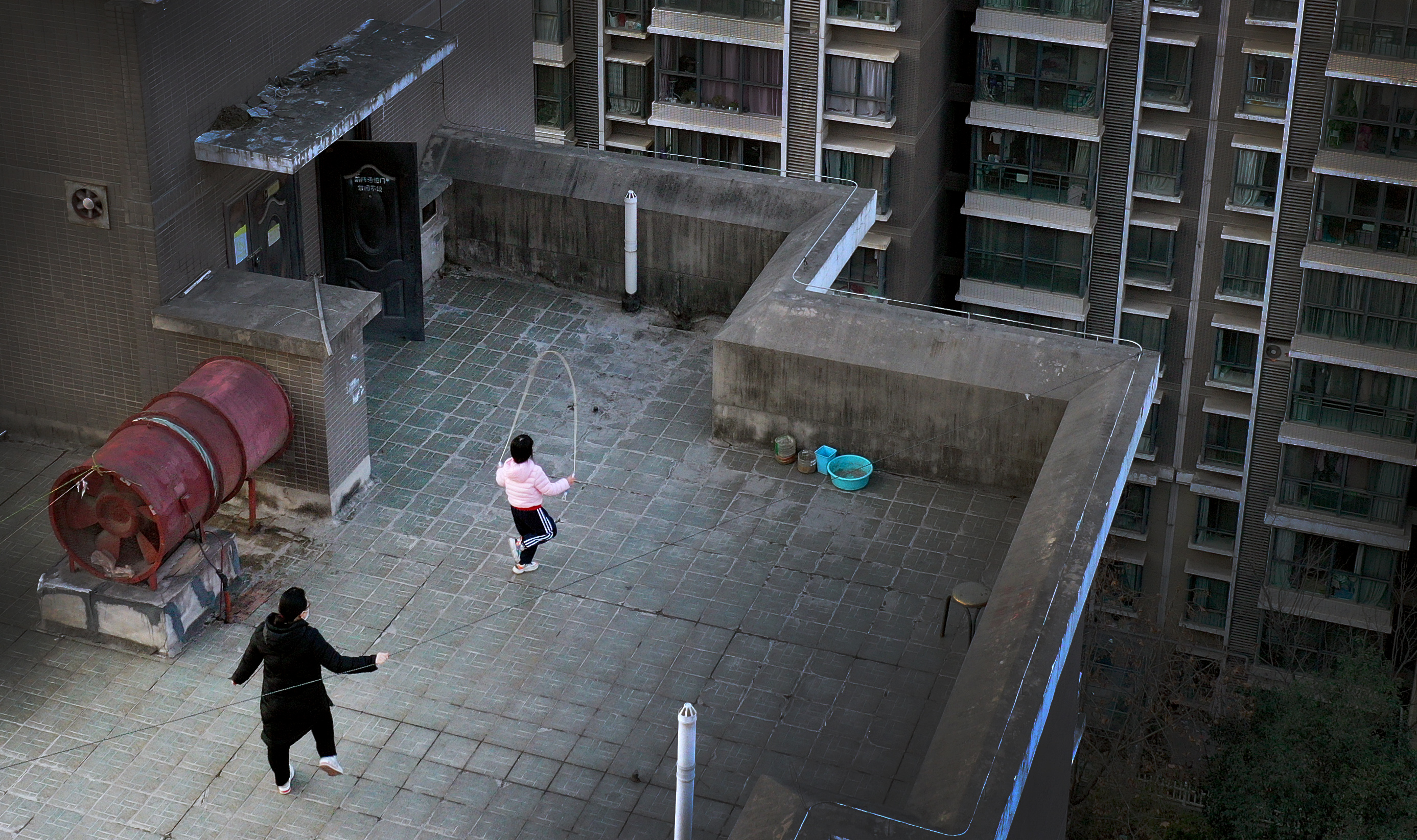 1月14日,西安市一小區(qū)居民在樓頂上跳繩鍛煉(無人機(jī)照片)。新華社記者 陶明 攝