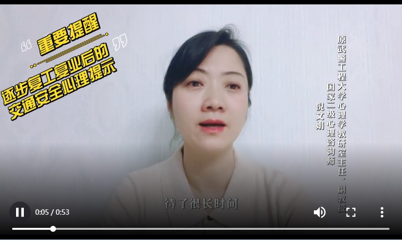 隨著西安復(fù)工復(fù)產(chǎn)的推進(jìn),“開車出門”成了恢復(fù)常態(tài)化防控之后,很多市民面臨的第一件事。今天(1月15日),西安交警邀請?jiān)渚こ檀髮W(xué)心理學(xué)教研室主任、副教授,國家二級心理咨詢師倪文娟,提醒駕駛員在家中狹小的空間內(nèi)長時(shí)間封閉后,如何保持安全出行心態(tài)。