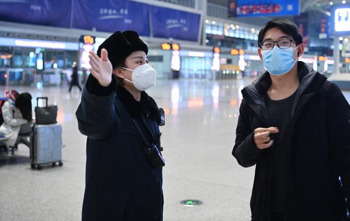 1月16日,西安北站客運(yùn)員(左)在候車大廳引導(dǎo)旅客乘車。新華社記者 陶明 攝