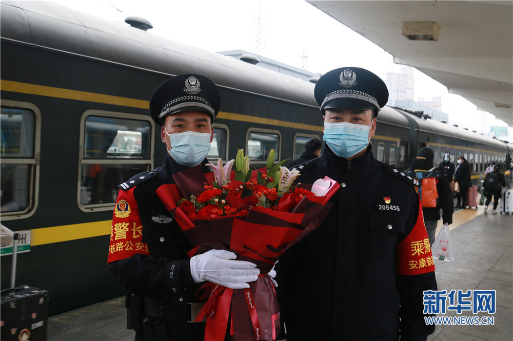 今年59歲的老汪是安康鐵路公安處乘警支隊(duì)的老乘警。1988年參加公安工作的他在紫陽站派出所工作了13年。2001年調(diào)入乘警支隊(duì),在乘警崗位上一待就是21年。而今年的春運(yùn)對老汪來說有著特殊的意義,春運(yùn)首日也是老汪最后一趟值乘。在安康站始發(fā)前,支隊(duì)政委呂昭琦專程送來鮮花表示對老汪多年工作的感謝。已堅(jiān)守34個春運(yùn),用老汪的話來說,自己沒有過轟轟烈烈的大事,只是做好本職的工作,從沒有對不起過頭頂?shù)木铡?/p>