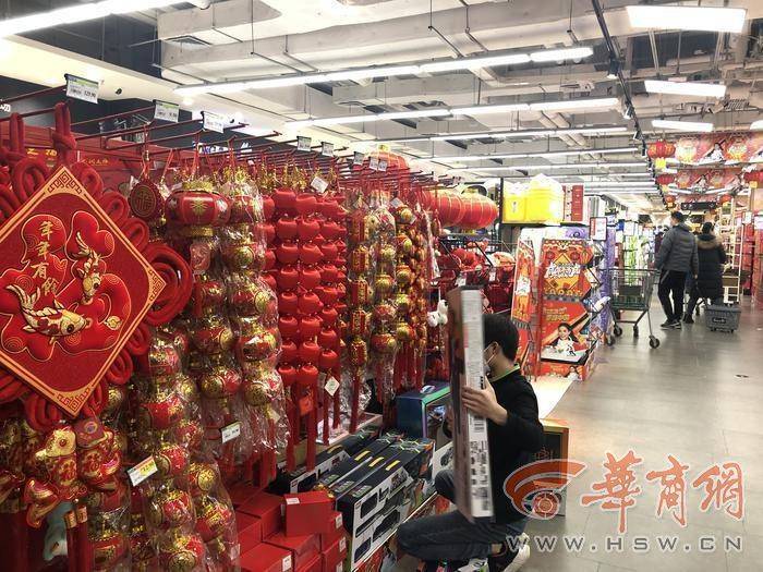 記者體驗(yàn)了一下,超市嚴(yán)格落實(shí)防疫要求,顧客掃碼,憑綠碼進(jìn)入。超市門口,有燈籠、“福”字等年貨。超市播著過年喜慶的音樂,貨物齊全,市民們?cè)谟行蛸?gòu)物,工作人員正在給部分貨物加貨。