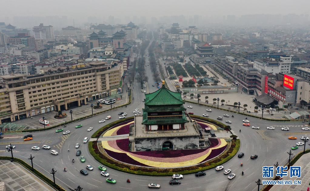 1月22日,西安市鐘樓盤道再現(xiàn)車水馬龍的景象(無(wú)人機(jī)照片)。新華社記者 陶明 攝