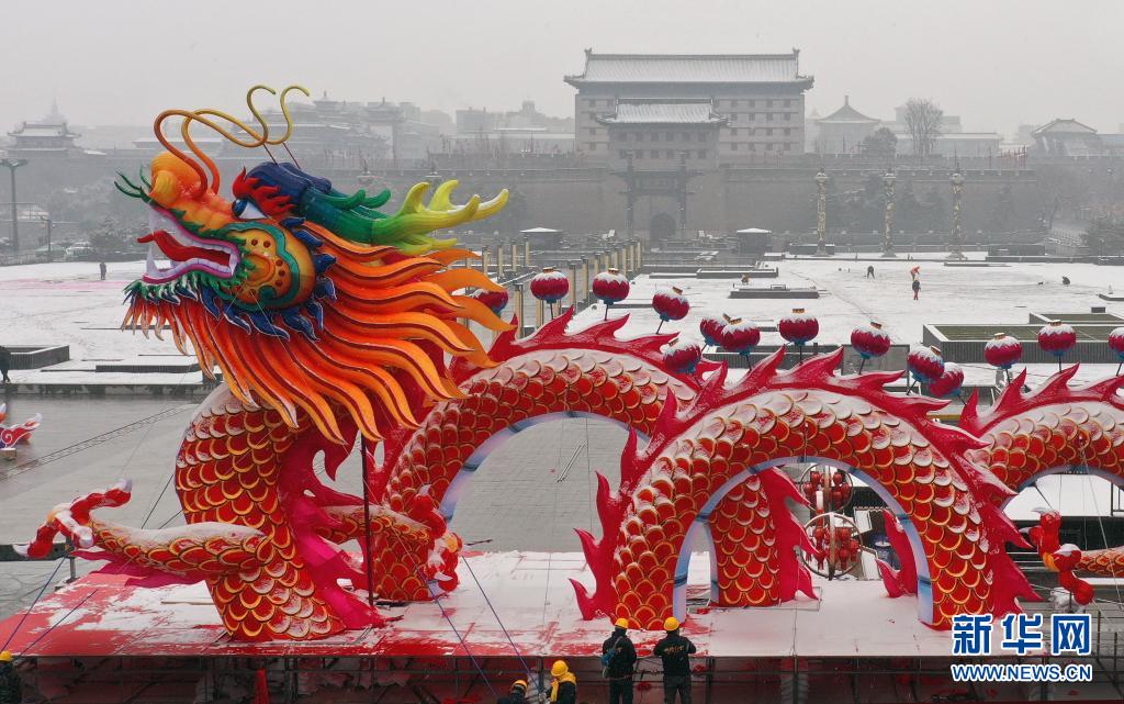 1月23日,施工人員在西安市南門(mén)廣場(chǎng)組裝龍鳳吉祥燈飾。