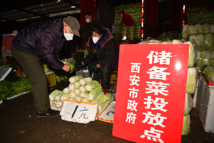 1月24日,市民(左一)在西安市新城區(qū)一處儲(chǔ)備菜投放點(diǎn)購買蔬菜。新華社記者張博文 攝