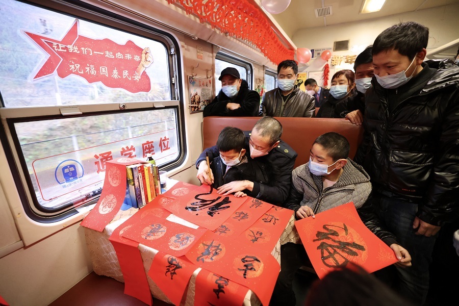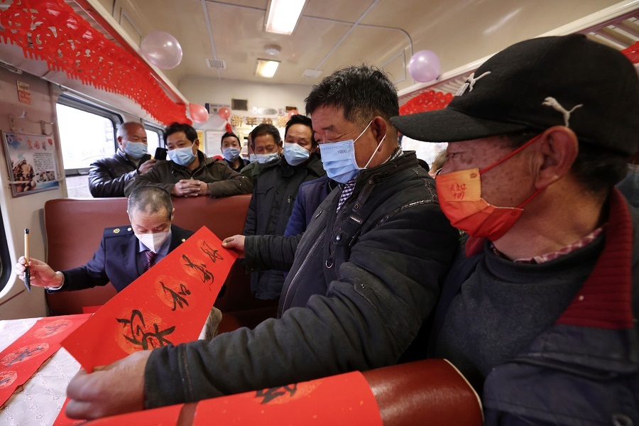 列車(chē)工作人員為旅客寫(xiě)春聯(lián)(央廣網(wǎng)發(fā) 劉松霖?cái)z)