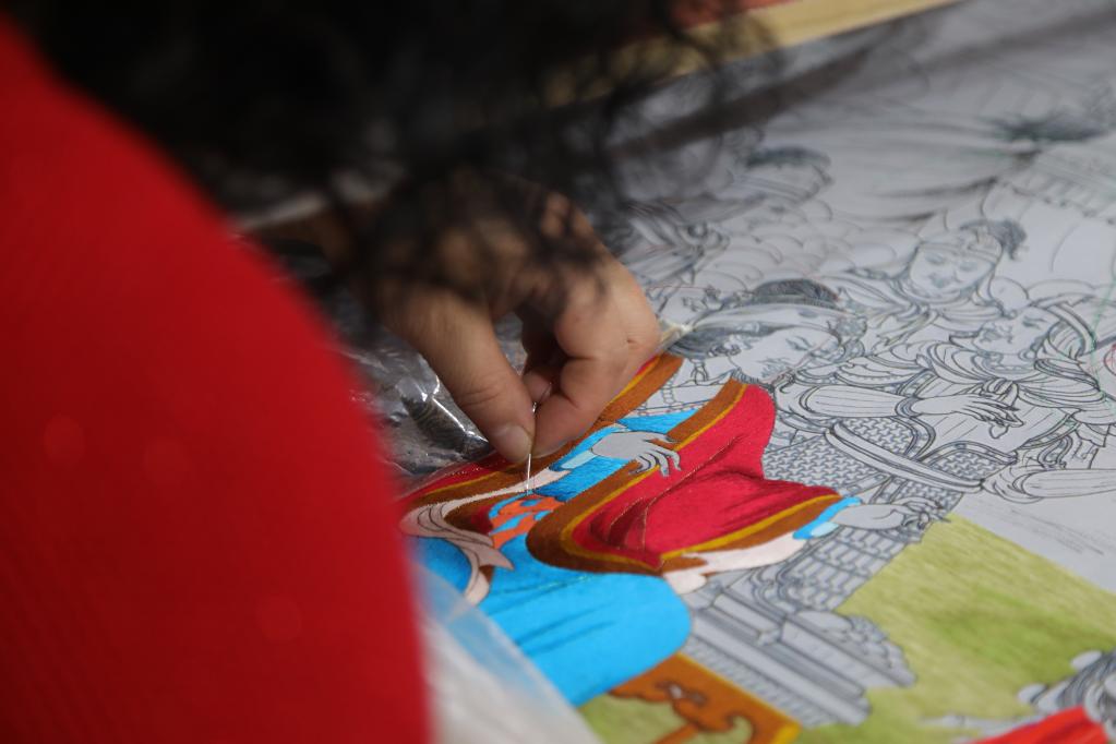 拉毛葉忠介紹,這些年,當(dāng)?shù)卣?jīng)常組織民間藝人去考察學(xué)習(xí)湘繡、蘇繡、粵繡、蜀繡等中國(guó)四大繡的針法,讓藏繡技藝推陳出新,更加凸顯出藏繡自身蘊(yùn)含的特色。