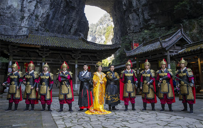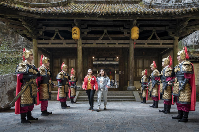 “女王駕到”“恭迎女王陛下”“諸位請(qǐng)起,游玩到此,觀(guān)景甚美,諸位與我,共享此景。”在天生三橋景區(qū)天福官驛客棧,一群身形魁梧的帶刀侍衛(wèi),整齊的站在驛站門(mén)口兩側(cè)恭迎每位入園的“女王”。現(xiàn)場(chǎng)儀式感爆棚,一身金黃的“女王”霸氣外露。驛站內(nèi)熱鬧的氛圍吸引了眾多游客參與,有的上前與侍衛(wèi)互動(dòng)拍照,有的主動(dòng)穿上“女王”服體驗(yàn)霸氣女王范,有的還主動(dòng)表演起了電影里女王翻牌的有趣橋段。“今天我最大,這樣過(guò)節(jié)著實(shí)過(guò)癮”玩得正起勁的劉女士表示,這是她過(guò)得最好玩、最具儀式感的女王節(jié)。