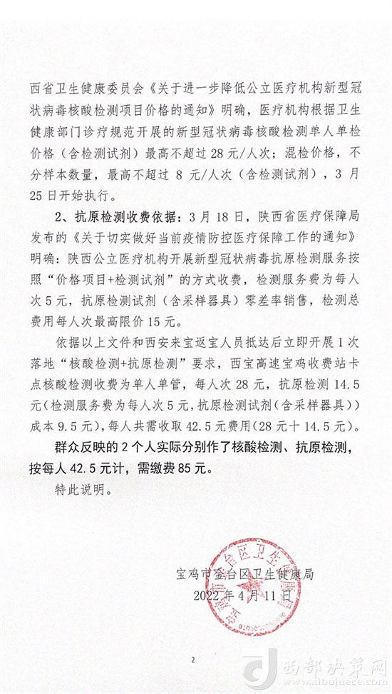 西部決策網(wǎng)接到群眾熱線:近日,西寶高速寶雞收費(fèi)站高速路口核酸檢測(cè)單人42.5元,收費(fèi)過(guò)高。記者隨即進(jìn)行實(shí)地調(diào)查并以《熱線調(diào)查|群眾質(zhì)疑高速路口核酸檢測(cè)收費(fèi)過(guò)高》為題進(jìn)行報(bào)道。