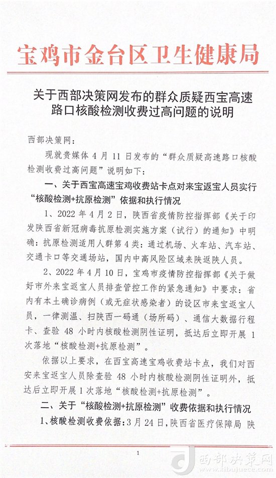 熱線回復(fù)|4月11日,寶雞市金臺(tái)區(qū)衛(wèi)生健康局就“群眾質(zhì)疑高速路口核酸檢測(cè)收費(fèi)過(guò)高問(wèn)題”向西部決策網(wǎng)回復(fù)并進(jìn)行了情況說(shuō)明。具體內(nèi)容如下:
