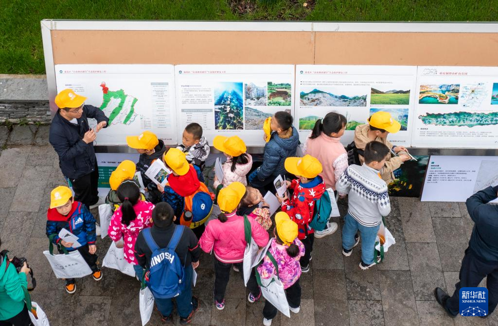 4月17日,參加活動(dòng)的中小學(xué)生在地質(zhì)專業(yè)工作人員的帶領(lǐng)下,對(duì)銅鑼山礦山公園的地質(zhì)遺跡和生態(tài)修復(fù)進(jìn)行科學(xué)考察(無(wú)人機(jī)照片)。