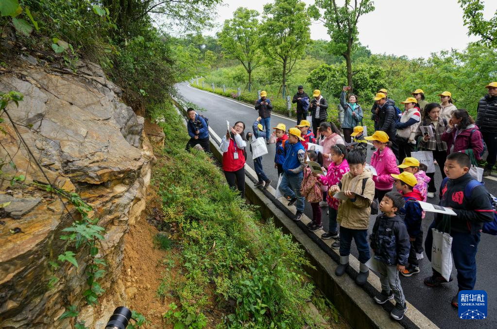 4月17日,參加活動(dòng)的地學(xué)旅游愛好者、中小學(xué)生和部分媒體工作者,在地質(zhì)專業(yè)工作人員的帶領(lǐng)下進(jìn)行銅鑼山科學(xué)考察。
