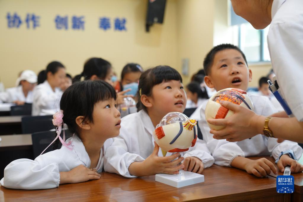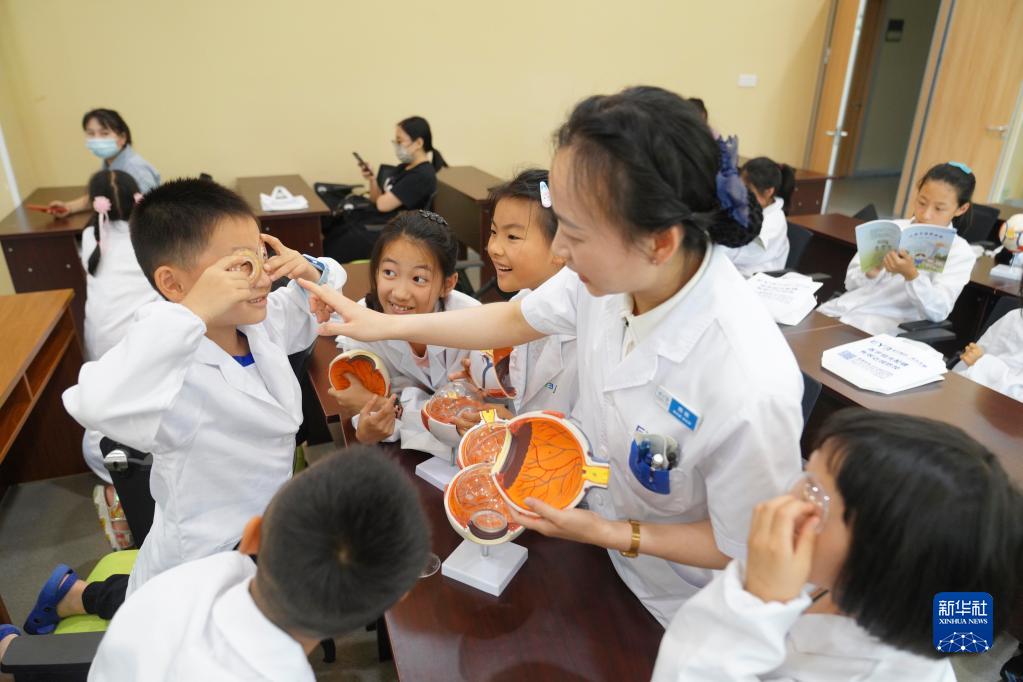 6月5日,在重慶市北碚區(qū)一家眼科醫(yī)院,一名驗(yàn)光師在給孩子們講解眼球構(gòu)造知識。新華社發(fā)(秦廷富 攝)