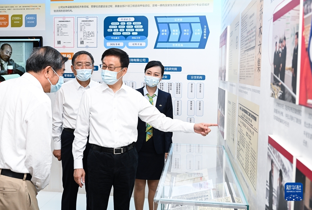 會前,韓正前往展廳,聽取中國國際工程咨詢有限公司的發(fā)展歷程介紹,了解公司承擔(dān)基礎(chǔ)設(shè)施、重大工程等重點領(lǐng)域咨詢?nèi)蝿?wù)以及高端智庫建設(shè)等情況。
