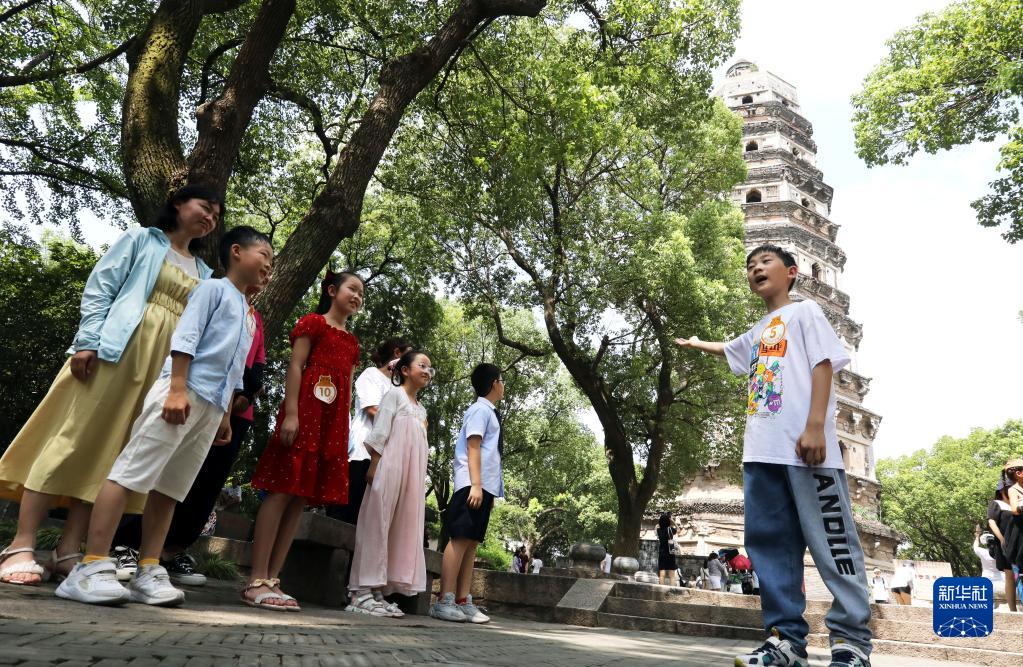 8月3日,在江蘇蘇州虎丘景區(qū),一名孩子在體驗“小小講解員”上崗實踐。新華社發(fā)(杭興微 攝)