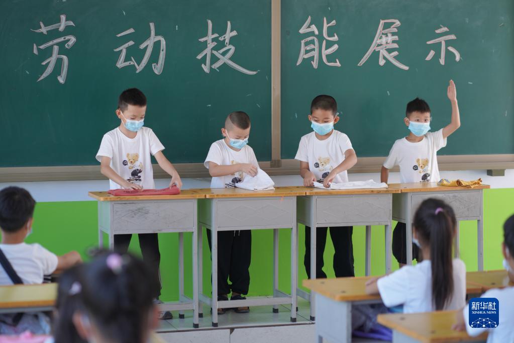 9月1日,河北省邢臺市內(nèi)丘縣西陽小學(xué)學(xué)生在開學(xué)第一課上比拼勞動技能。新華社發(fā)(劉繼東 攝)