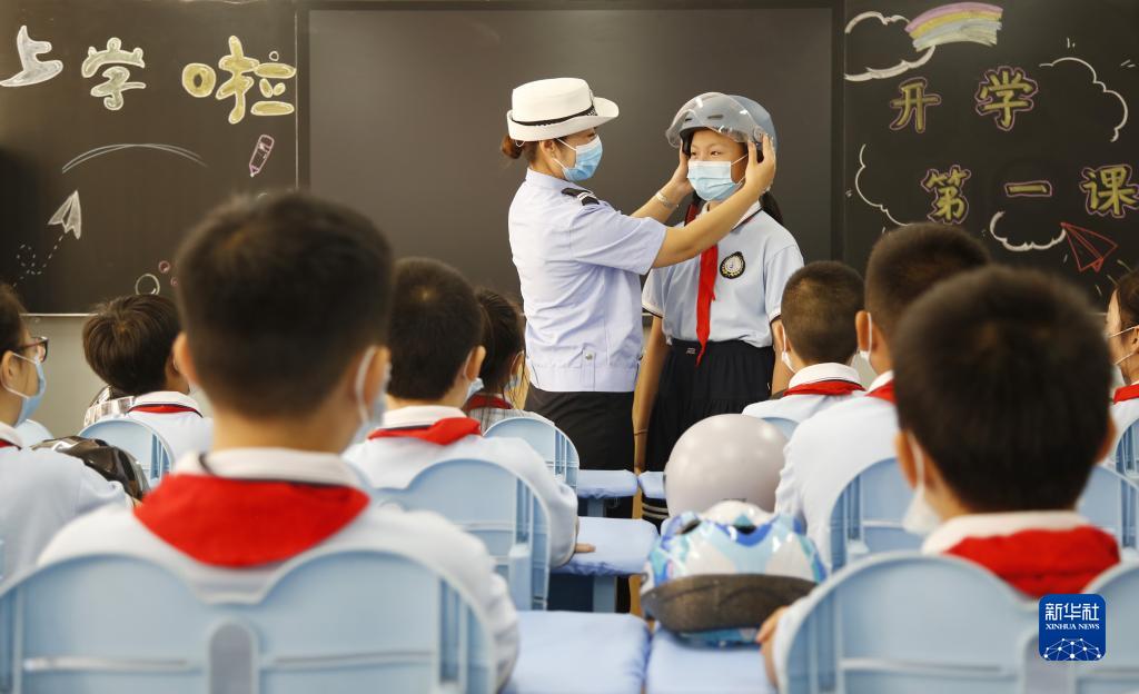 9月1日,在河北省邢臺市逸夫小學(xué),交通民警給學(xué)生上交通安全課。新華社發(fā)(張馳 攝)