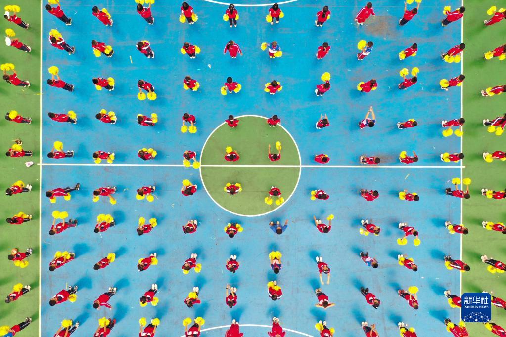 9月1日,貴州省貴陽市開陽縣第一小學(xué)學(xué)生在跳自編舞《天天向上》(無人機照片)。新華社發(fā)(袁福洪 攝)