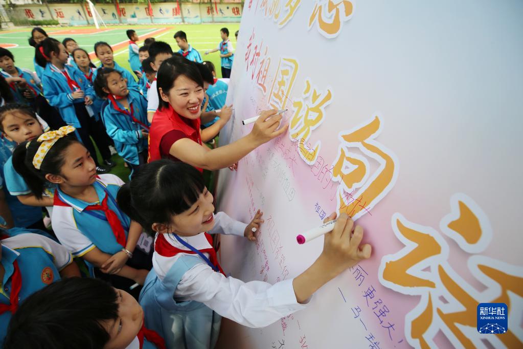 9月1日,山東省郯城縣郯城街道龍泉社區(qū)工作者與小學(xué)生一起寫下對祖國的祝福語。新華社發(fā)(張春雷 攝)
