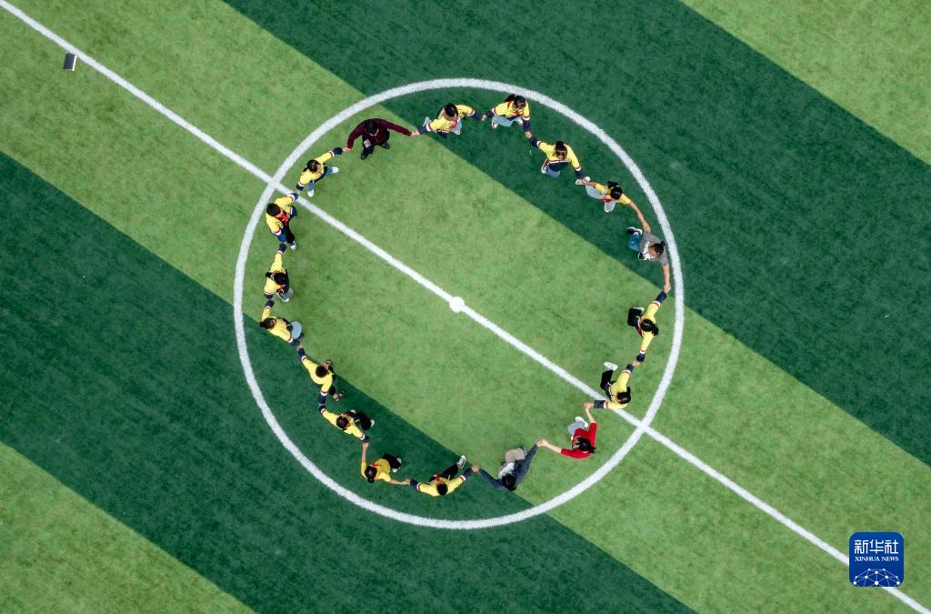 9月1日,貴州省黔西市定新小學(xué)學(xué)生在操場上做游戲(無人機照片)。新華社發(fā)(范暉 攝)