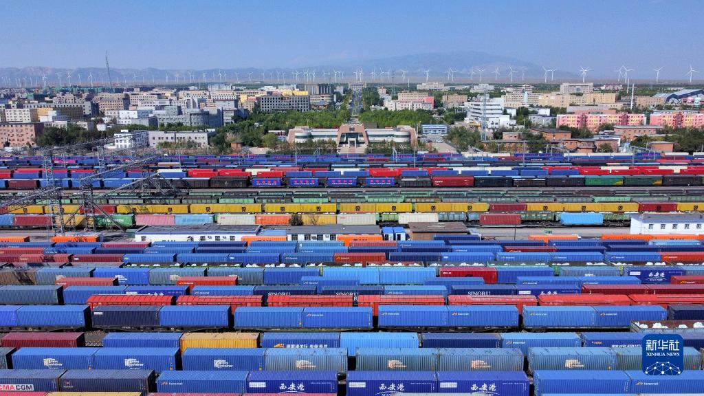 在新疆阿拉山口站寬準(zhǔn)軌編組場(chǎng),出入境中歐班列集結(jié)等待出發(fā)(2022年9月10日攝,無(wú)人機(jī)照片)。新華社發(fā)(陳乾 攝)