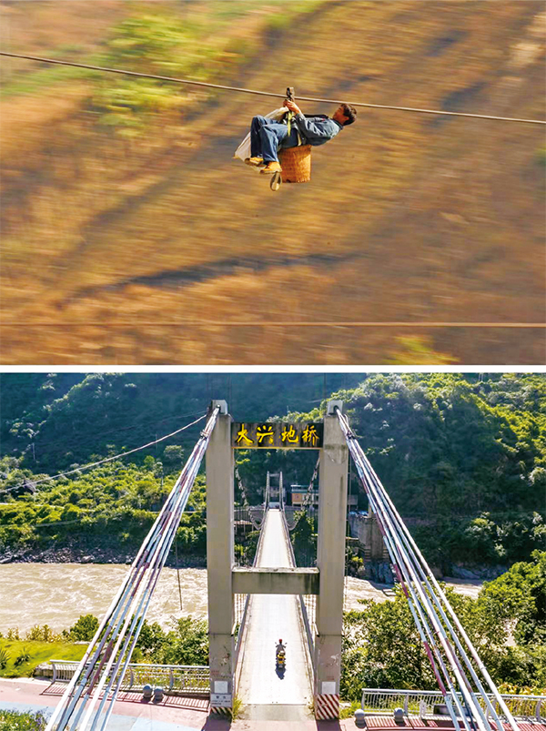 “過江靠溜索”曾是怒江兩岸群眾出行的重要方式。2013年,國家實(shí)施“溜索改橋”項(xiàng)目,幫助西部邊遠(yuǎn)山區(qū)群眾結(jié)束溜索時代,怒江州怒江段上溜索被改造為各式跨江橋梁,完成了沿江人民“天塹變通途”的企盼。上圖為2013年2月2日,在云南省怒江州瀘水市六庫街道,一名居民背著背簍溜索過江(新華社記者 王長山/攝)。下圖為2022年9月13日,瀘水市居民騎摩托車通過大興地橋(無人機(jī)照片,新華社記者 江文耀/攝)。