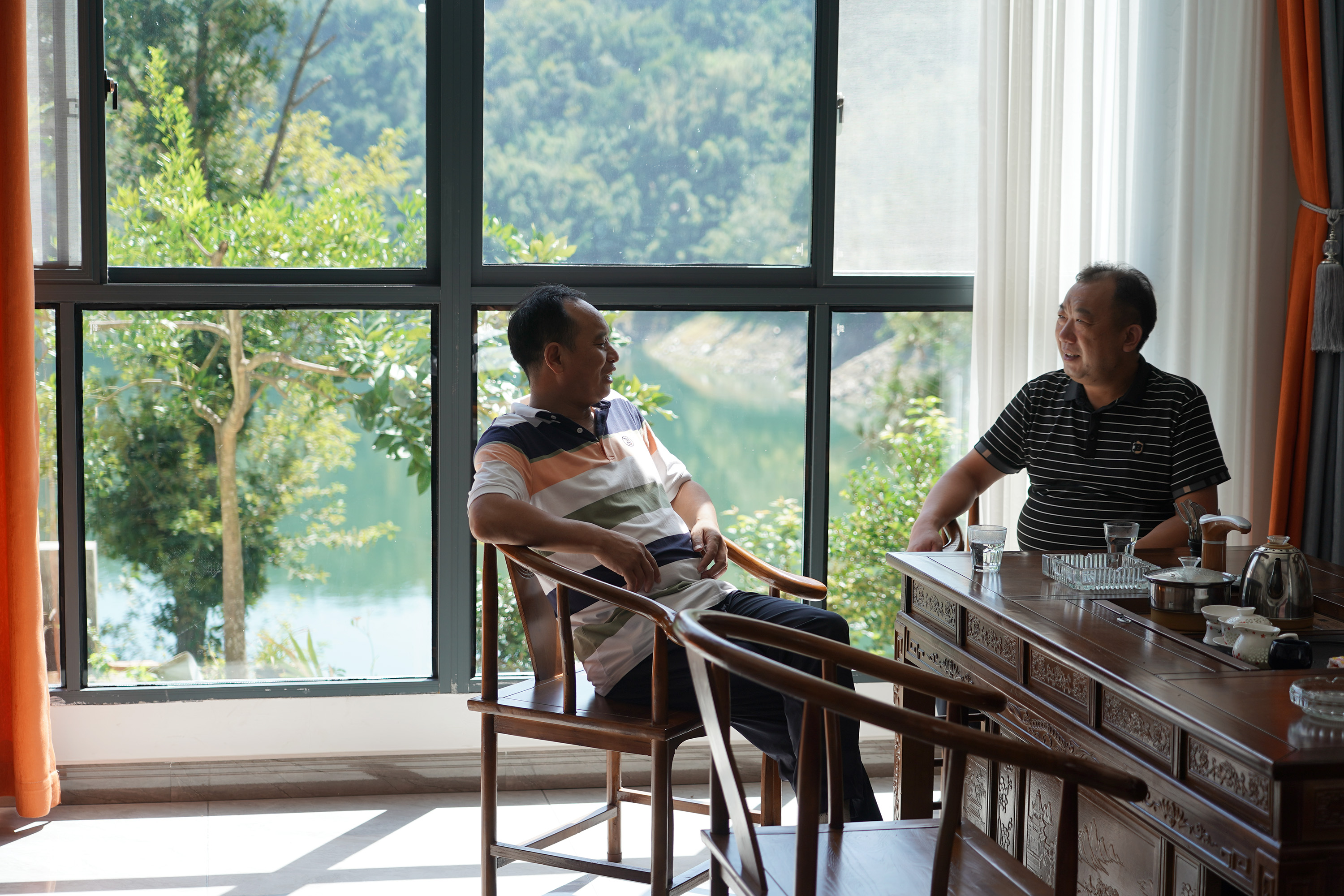 游客在安康市漢濱區(qū)漢江瀛湖邊的一家農(nóng)家樂(lè)內(nèi)休息聊天。(新華社記者 邵瑞 攝)