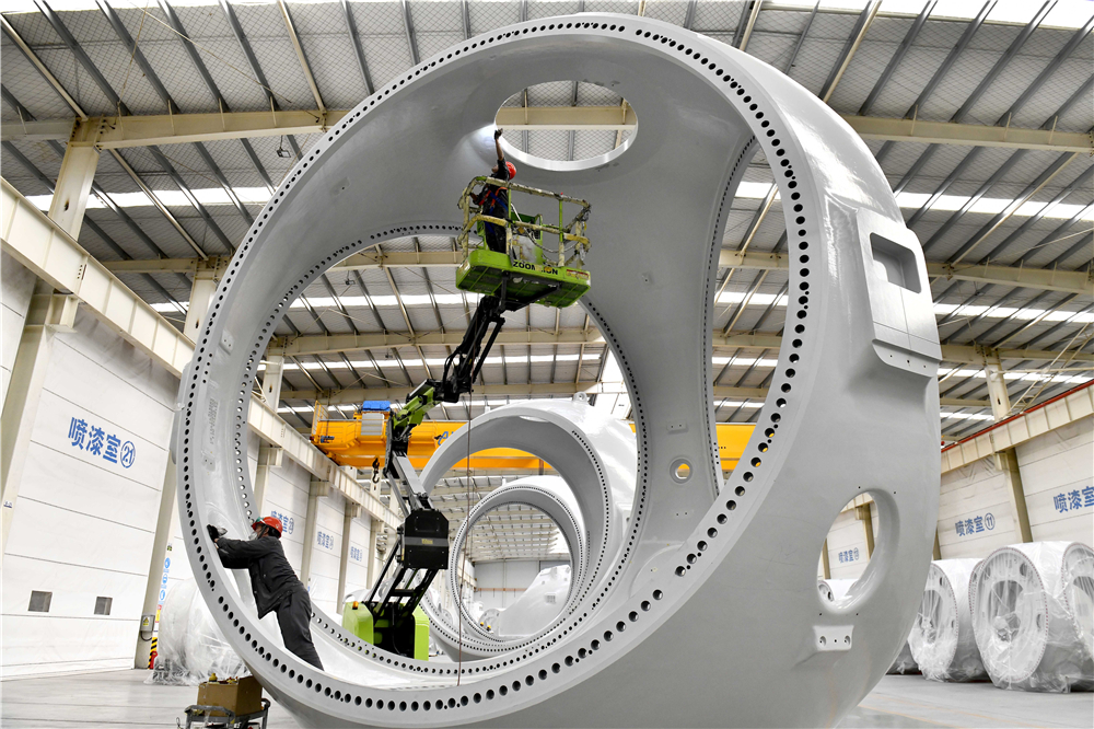 在山東省惠民縣風(fēng)電裝備產(chǎn)業(yè)基地涂裝車間,工作人員對風(fēng)電輪轂進(jìn)行涂裝(2022年6月7日攝)。新華社記者 郭緒雷 攝