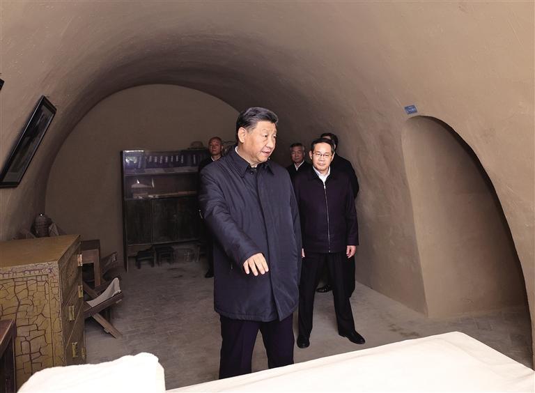 10月27日,中共中央總書記、國家主席、中央軍委主席習近平帶領中共中央政治局常委李強、趙樂際、王滬寧、蔡奇、丁薛祥、李希,瞻仰延安革命紀念地。這是習近平等在楊家?guī)X參觀毛澤東舊居。 新華社記者 鞠鵬攝