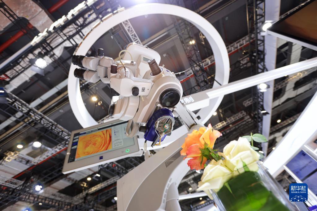 11月6日在第五屆進(jìn)博會(huì)蔡司展臺(tái)拍攝的眼科導(dǎo)航手術(shù)顯微鏡。新華社記者 李京 攝