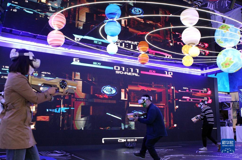11月7日,在第五屆進(jìn)博會(huì)技術(shù)裝備展區(qū)的人工智能專區(qū),體驗(yàn)者借助VR設(shè)備進(jìn)行電競互動(dòng)游戲。新華社記者 侯俊 攝