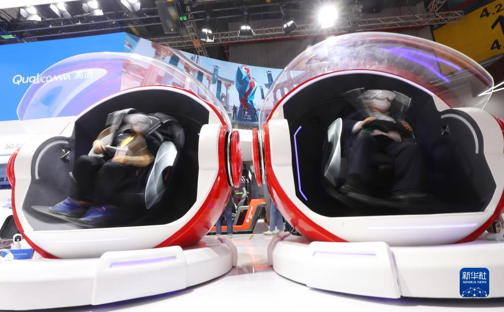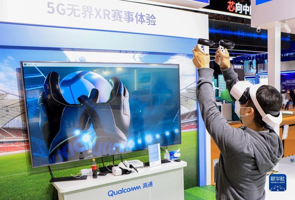 11月7日,參觀者在第五屆進(jìn)博會(huì)美國高通公司展臺(tái)參與5G無界XR賽事體驗(yàn)。新華社記者 李京 攝