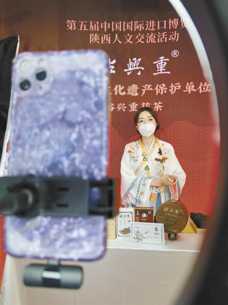 進(jìn)博會(huì)期間,身著古裝的工作人員為裕興重茯茶進(jìn)行直播帶貨。