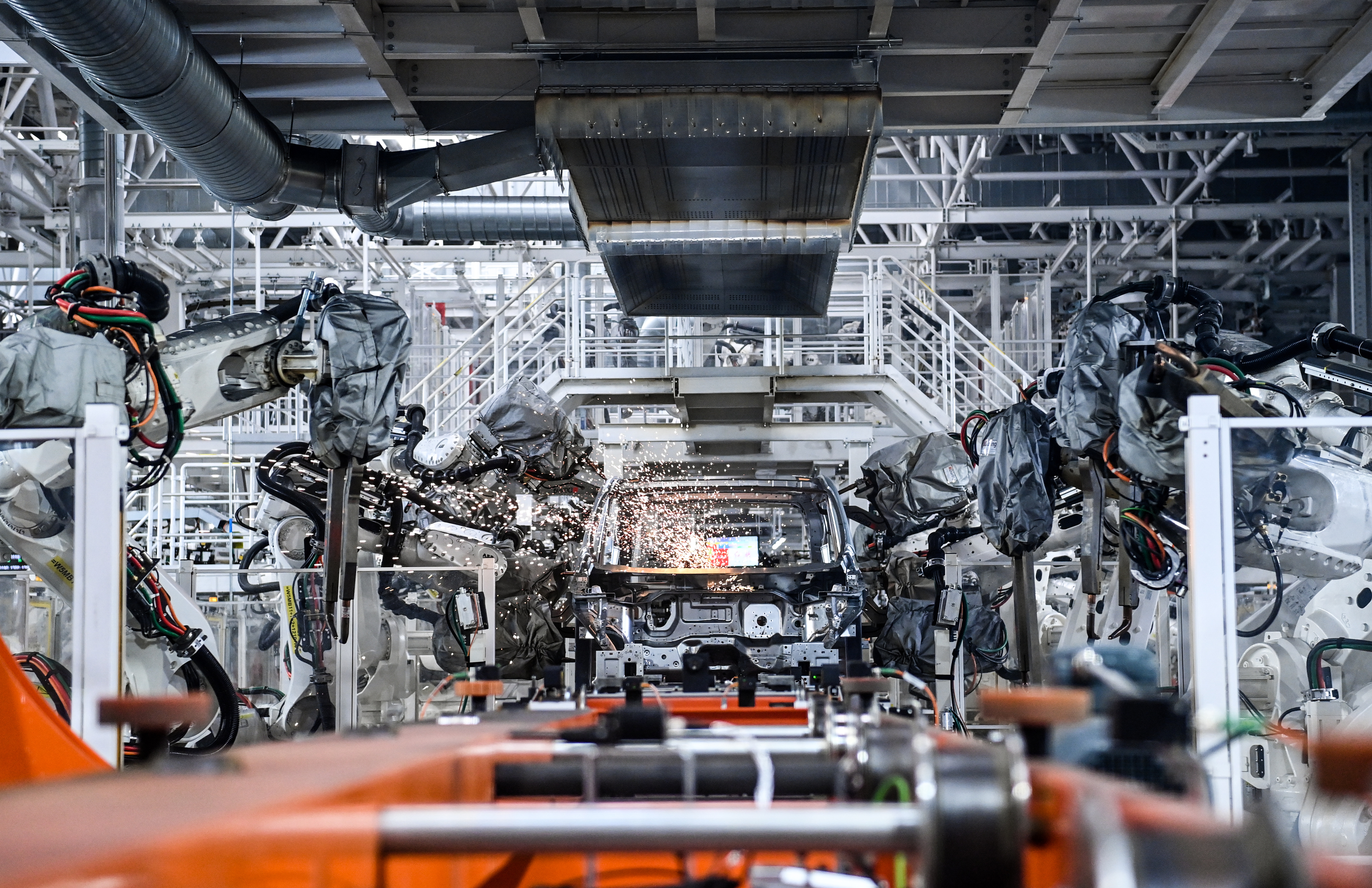 2022年10月17日,在吉林長(zhǎng)春中國(guó)第一汽車集團(tuán)有限公司紅旗繁榮工廠焊裝車間內(nèi),焊裝機(jī)器人在生產(chǎn)線上焊接車身。新華社記者 顏麟蘊(yùn) 攝