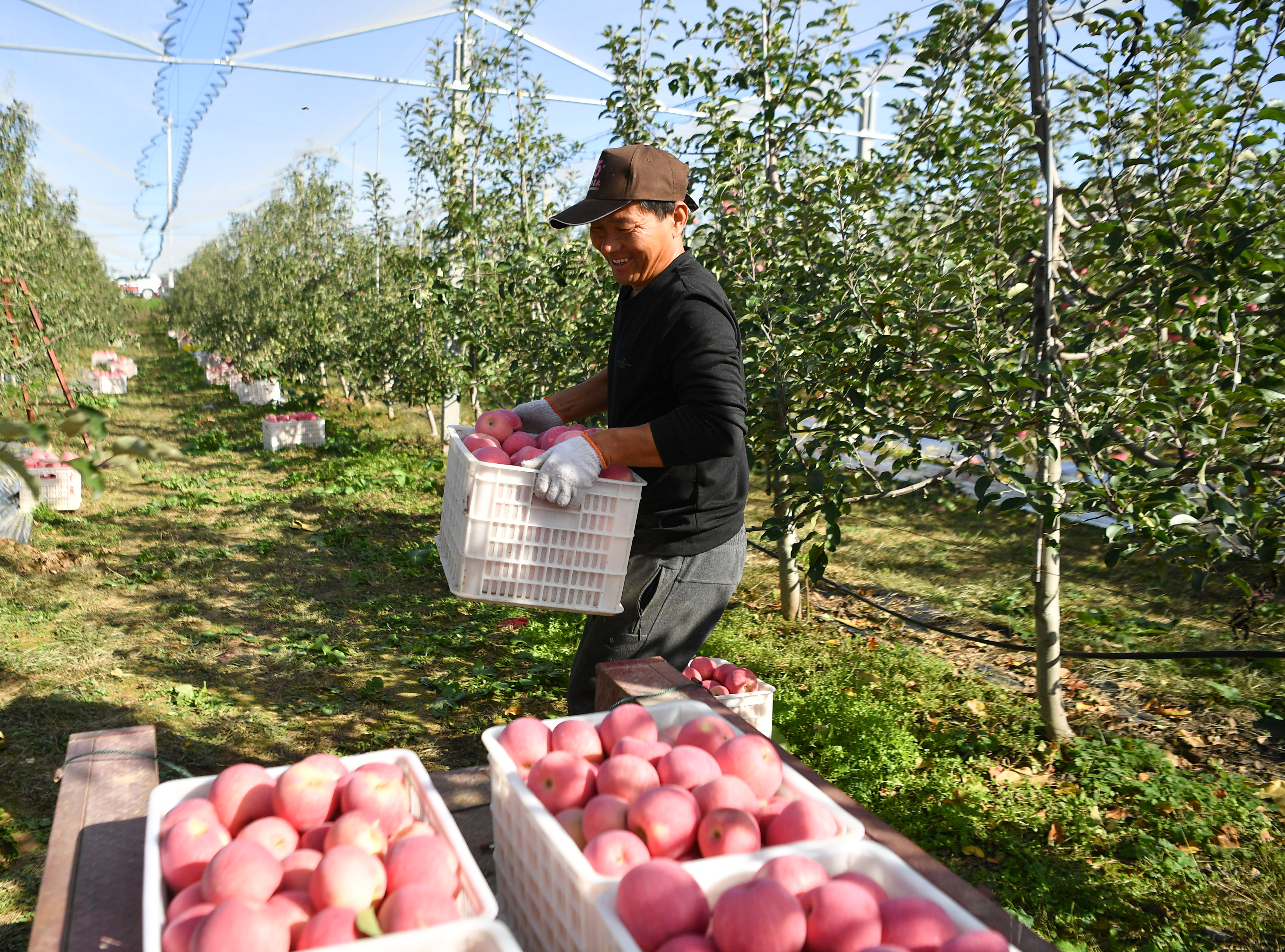 2022年10月10日,在陜西省延安市洛川縣永鄉(xiāng)鎮(zhèn)阿寺村一處果園,果農(nóng)在搬運(yùn)蘋果。新華社記者 張博文 攝