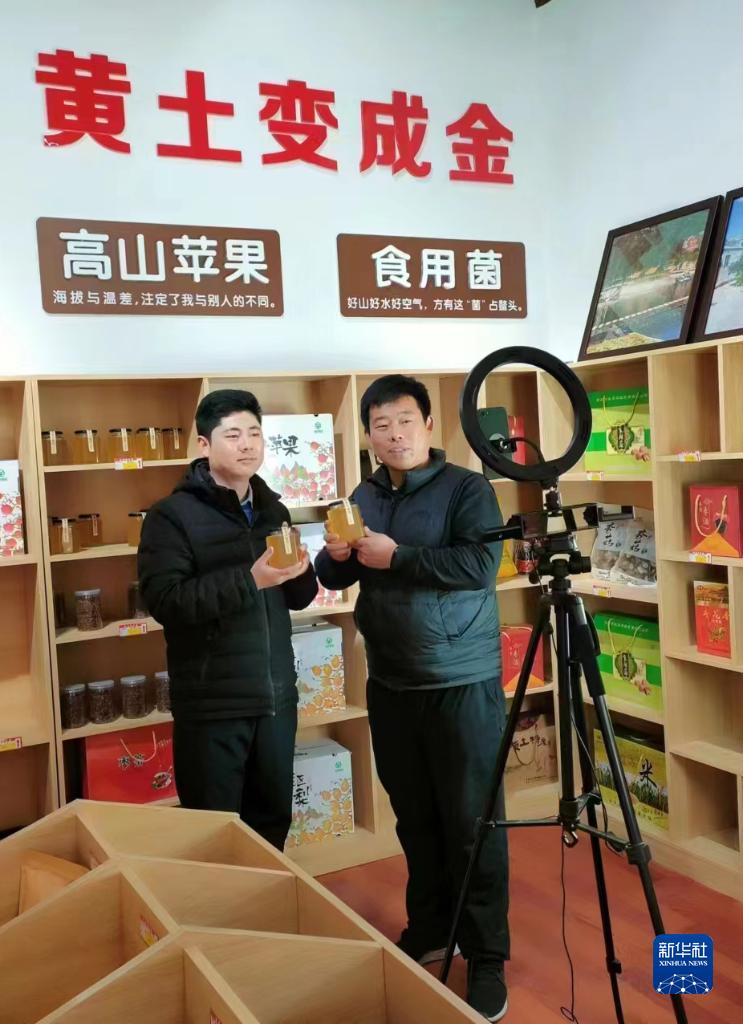 2022年11月6日,在河北省阜平縣顧家臺村的電商直播間,顧家臺村第一批返鄉(xiāng)創(chuàng)業(yè)的“90后”青年顧騰飛(右)在直播賣貨。新華社發(fā)(曹建平 攝)