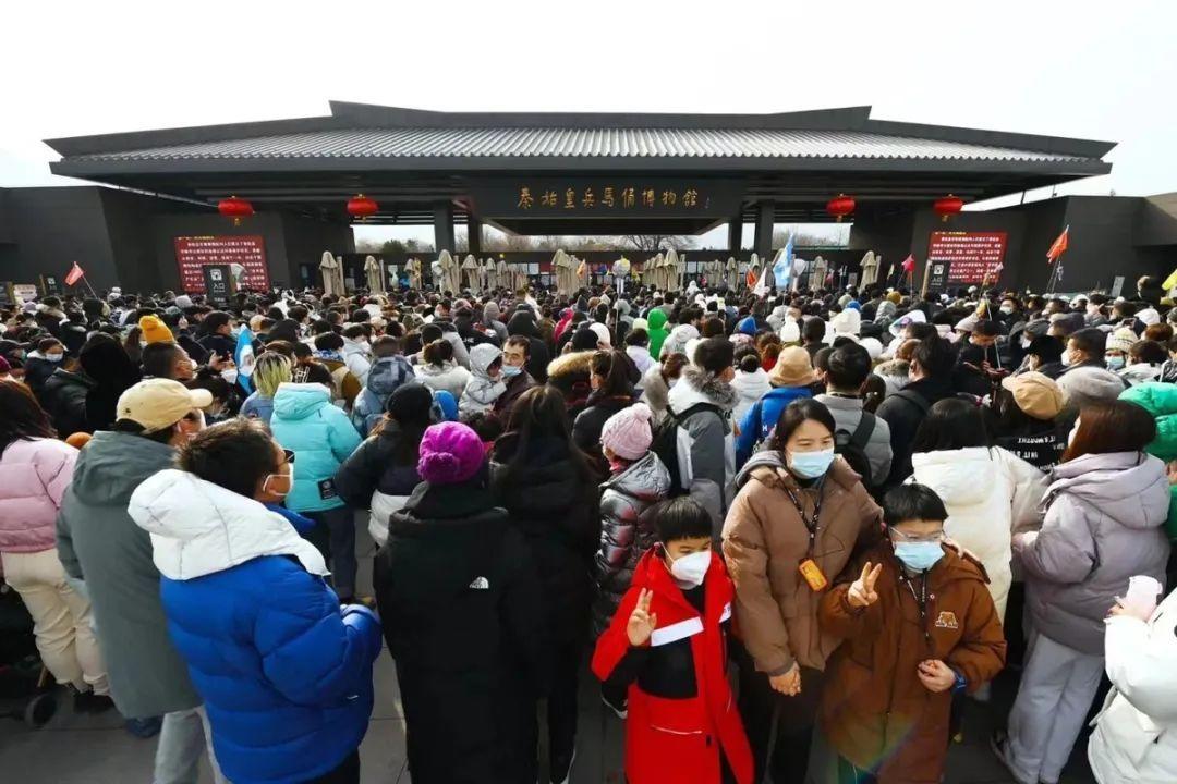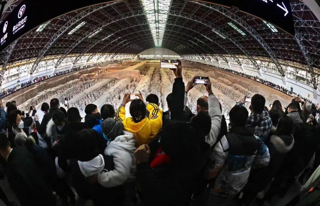 1月23日(大年初二),秦始皇帝陵博物院迎來了最大承載量,來自全國各地的觀眾參觀熱情高漲,該院內(nèi)外重現(xiàn)了久別的客流高峰。兵馬俑園區(qū)人山人海,熙熙攘攘,觀眾都在有序排隊(duì)進(jìn)行參觀。13時(shí),秦始皇帝陵博物院已經(jīng)達(dá)到最大承載量,所有門票售罄,院方充分感受到了大家的熱情。