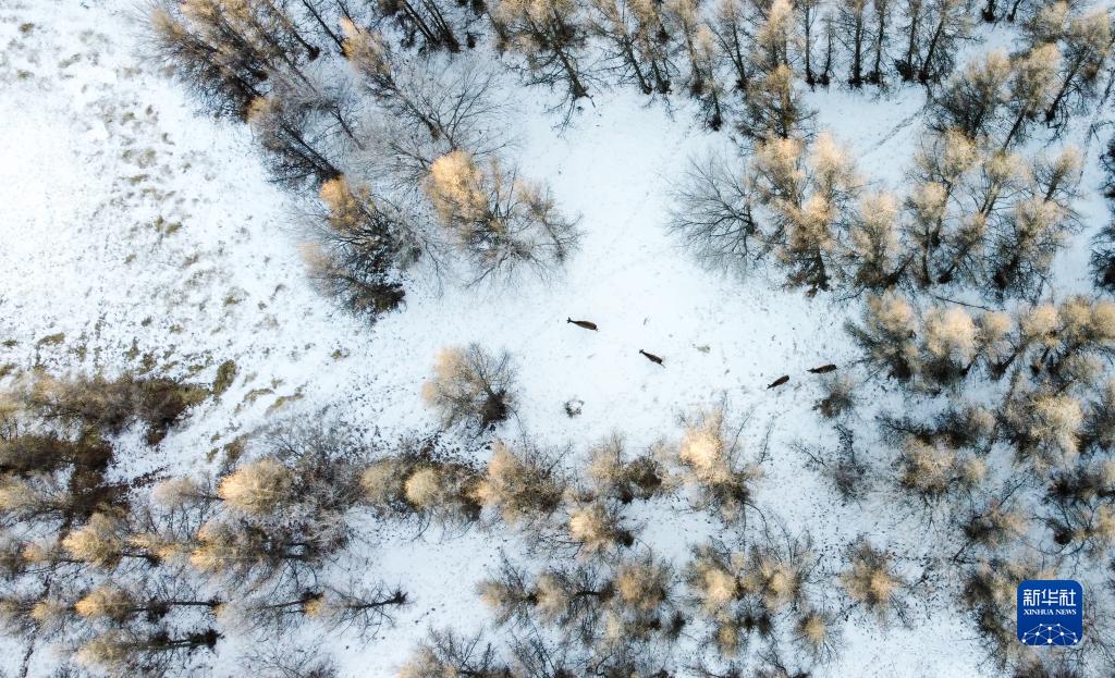 1月29日,一群馬鹿在灤河源國家森林公園內覓食(無人機照片)。新華社記者 賀書琛 攝
