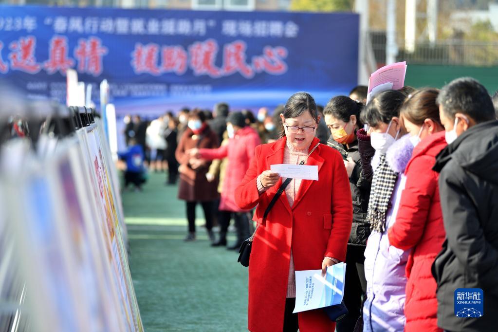 1月31日,求職者在湖北省襄陽(yáng)市??悼h2023年春風(fēng)行動(dòng)暨就業(yè)援助月現(xiàn)場(chǎng)招聘會(huì)上了解崗位信息。新華社發(fā)(楊韜攝)