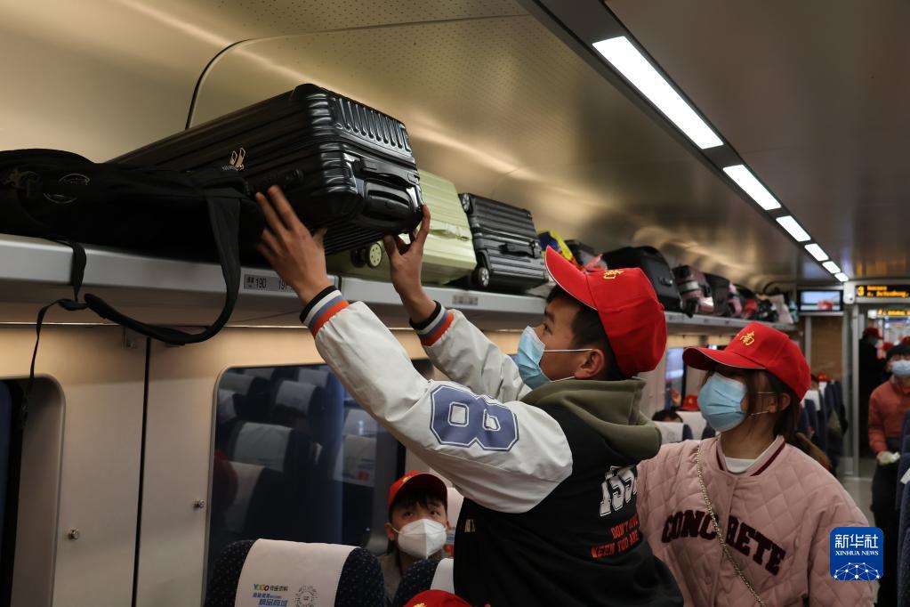 1月30日,旅客在D2879次務(wù)工專列上放行李。這是2023年貴陽(yáng)開出的首趟高鐵務(wù)工專列。新華社記者 劉續(xù) 攝