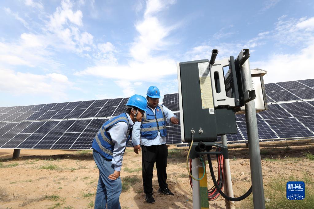 國(guó)家電投五凌電力余丁光伏電站職工在檢修設(shè)備(2022年8月31日攝)。新華社記者 盧鷹 攝
